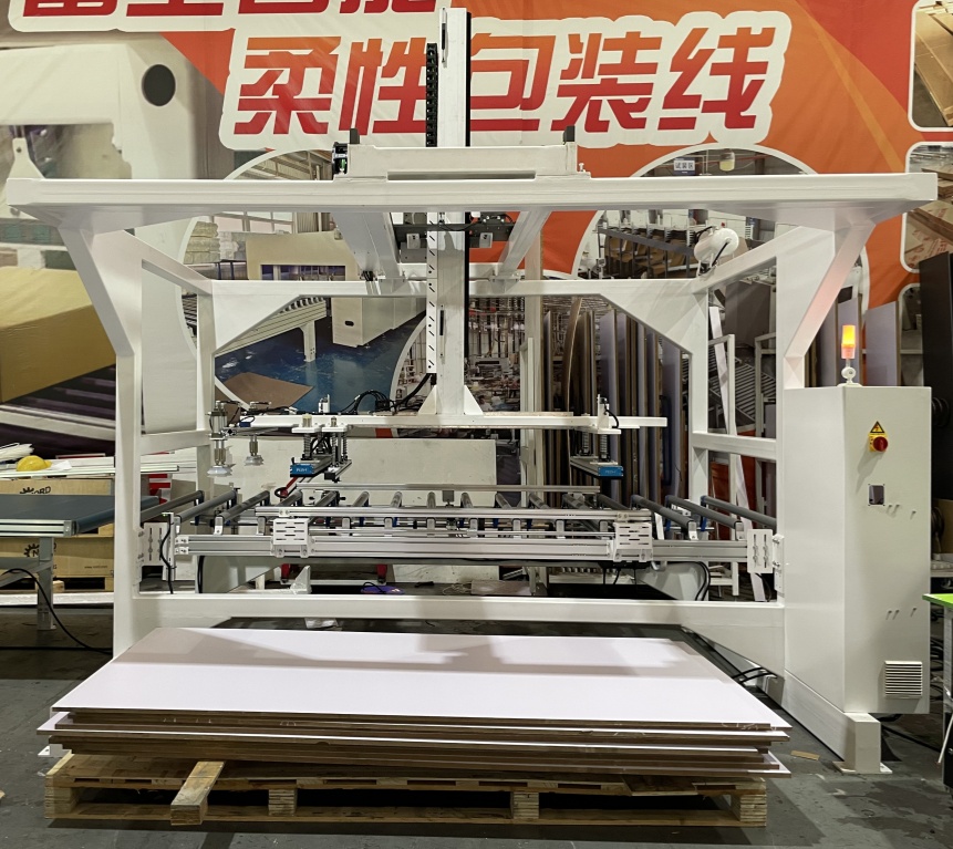 1. Naložitev priprave: Delavci postavijo celotne palete, ki jih bodo obdelali plošče na osnovi lesa na stojalo za dovajanje opreme. Dvigovalna platforma stojala se samodejno prilagodi začetni višini zajemanja.